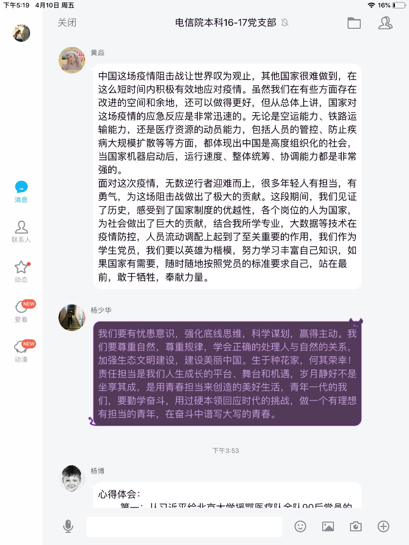 在本次活动中,党员同志学习了《动员广大群众积极参与爱国卫生运动的倡议书》、《习近平给北京大学援鄂医疗队全体“90”后党员的回信》、《为打赢疫情防控阻击战提供强大科技支撑》等文章。随后,党员同志在线上就本次的学习内容进行了交流沟通,同志们表示,通过此次疫情,感受到了祖国的强大,科技的进步。同时,党员同志们还提出,我们青年一代更应该努力奋斗,刻苦学习,为社会、国家奉献出自己的一份力量,正如习近平总书记在信中说到的那样“在党和人民最需要的地方绽放绚丽之花”。支部书记张颜指出,青年一代,要有伟大的理想和家国情怀,要在行动中起到模范带头作用,用实际行动证明青年一代是好样的,是能担当大任的一代。