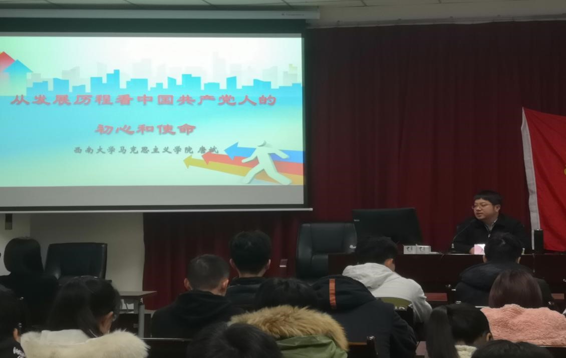 首先,马克思主义学院副教授唐斌老师带来了以“从发展历程看中国共产党人的初心和使命”为主题的专题党课,唐老师以“中国特色社会主义进入了新时代”为引言,阐述了在新时代下,中国共产党不变的初心与使命。随后,唐老师从党的发展历程向同学们讲述了中国共产党不同发展时期“初心与使命”的不同语言表达方式,着重指出其内在蕴含的人民至上的价值指向始终如一,人民就是党的初心。最后唐老师表达了对同学们的期望,希望同学们要更用心的学习党章的内容,把党的先进思想内化于心,外化于形,争取早日成为一名合格的共产党员。