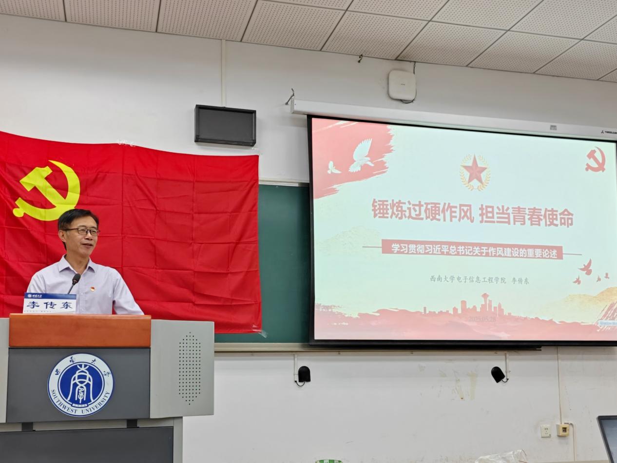 5月28日上午,学院党委书记李传东以《锤炼过硬作风 担当青春使命——学习贯彻习近平总书记关于作风建设的重要论述》为题,为毕业生党员讲授专题党课。他从“理论铸魂——作风建设是党的生命线”“纪律固本——中央八项规定的实践要求”“使命担当——以优良作风引领青春航向”三个方面引导毕业生党员深入学习贯彻习近平总书记关于加强党的作风建设的重要论述,贯彻落实中央八项规定及其实施细则精神,进一步树牢毕业生党员的纪律意识、规矩意识和底线意识,涵养严谨正派的行为作风。