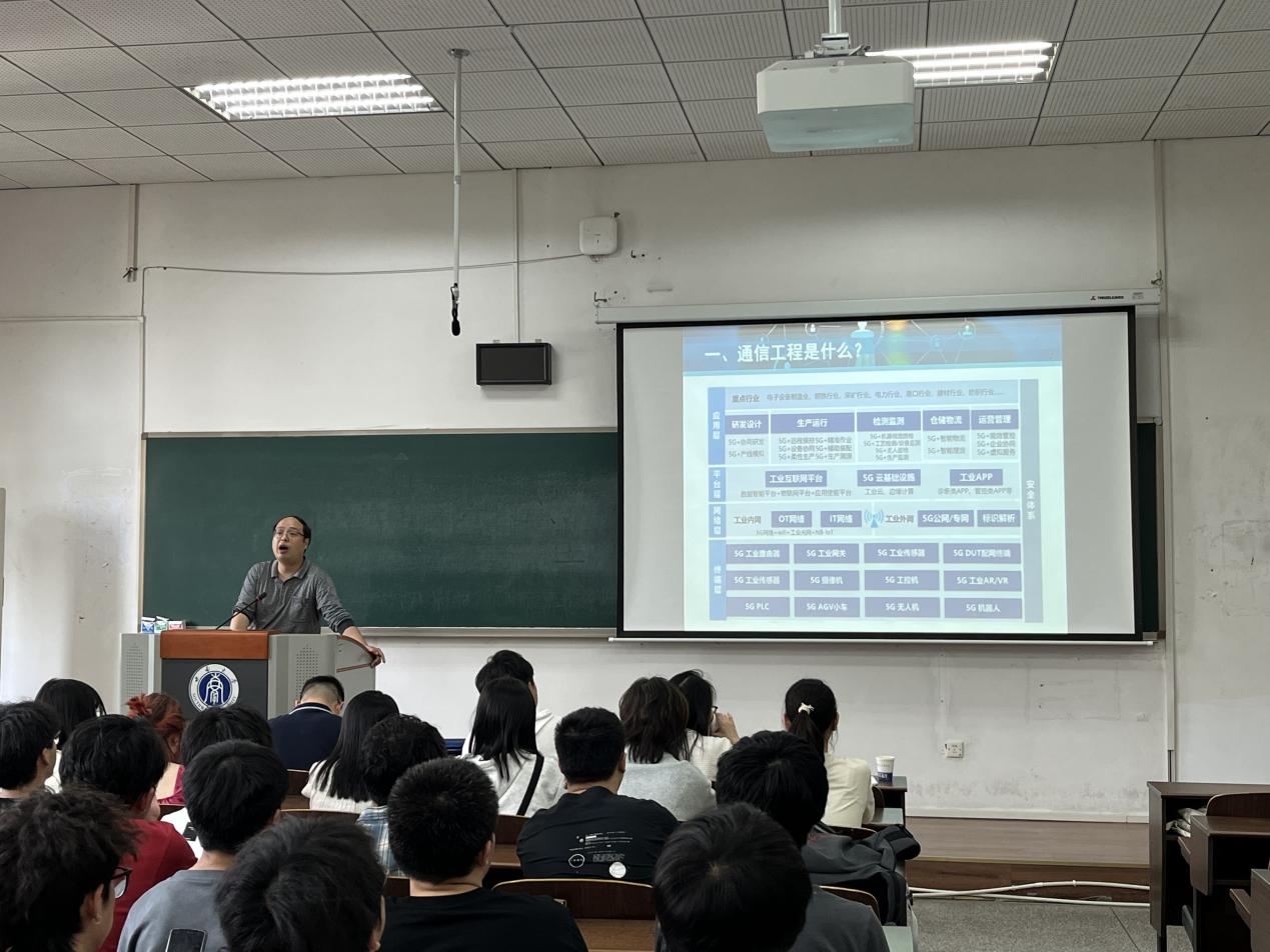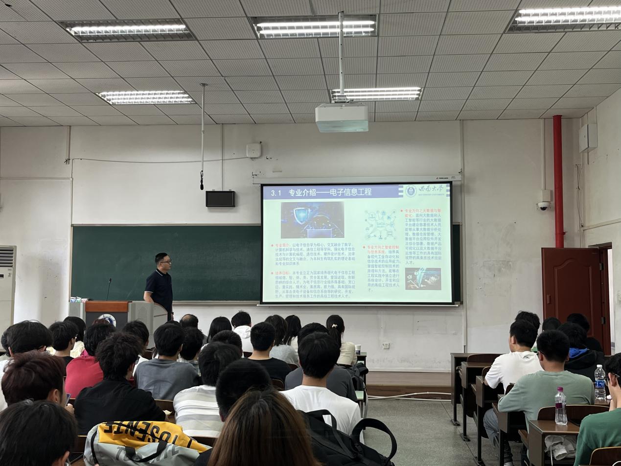 李华青简要介绍了2023级电子信息类专业分流的工作流程。贺付亮、张伟分别详细介绍了通信工程、电子信息工程两个本科专业的基本情况、专业前景、培养方案、学习方法、就业去向等问题。接下来,高渤结合学生成绩和职业规划给出建议,希望同学们选择最适合自己的专业。