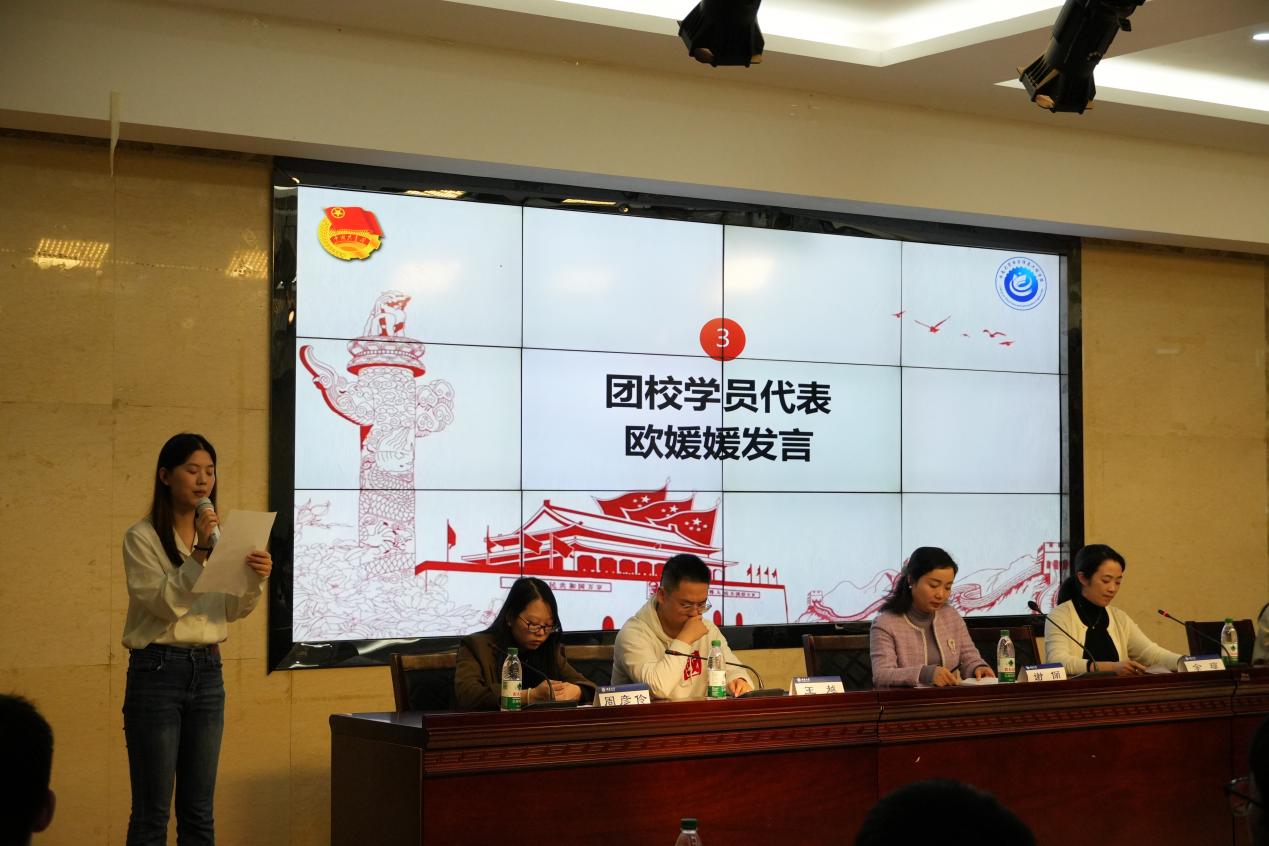 随后,第十二期团校学员代表欧媛媛发言,她分享了自己对新时代青年的认识,认为新时代青年应当政治坚定、勇于担当、开拓创新、全面发展,并呼吁同学们在民族复兴征程上书写无悔的青春华章。