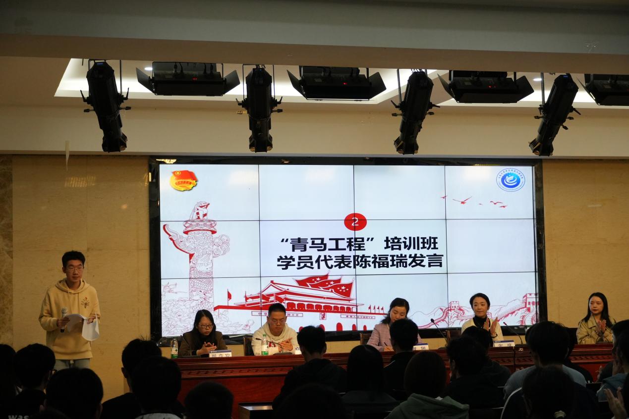 接着,第八期“青马工程”培训班学员代表陈福瑞发言。他分享了自己在“青马工程”培训班学习期间的感受,勉励新学员们坚定理想信念、勇于实践探索、敢于吃苦奋斗。他表示,作为电子信息专业的新工科人才,我们肩负着新使命、新挑战,要坚定不移听党话、跟党走,努力成长为堪当民族复兴重任的时代新人。