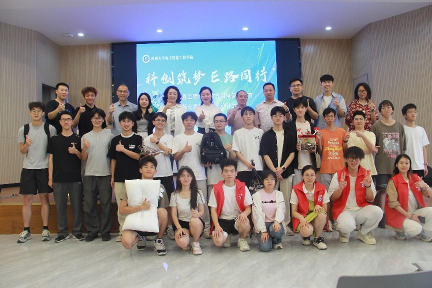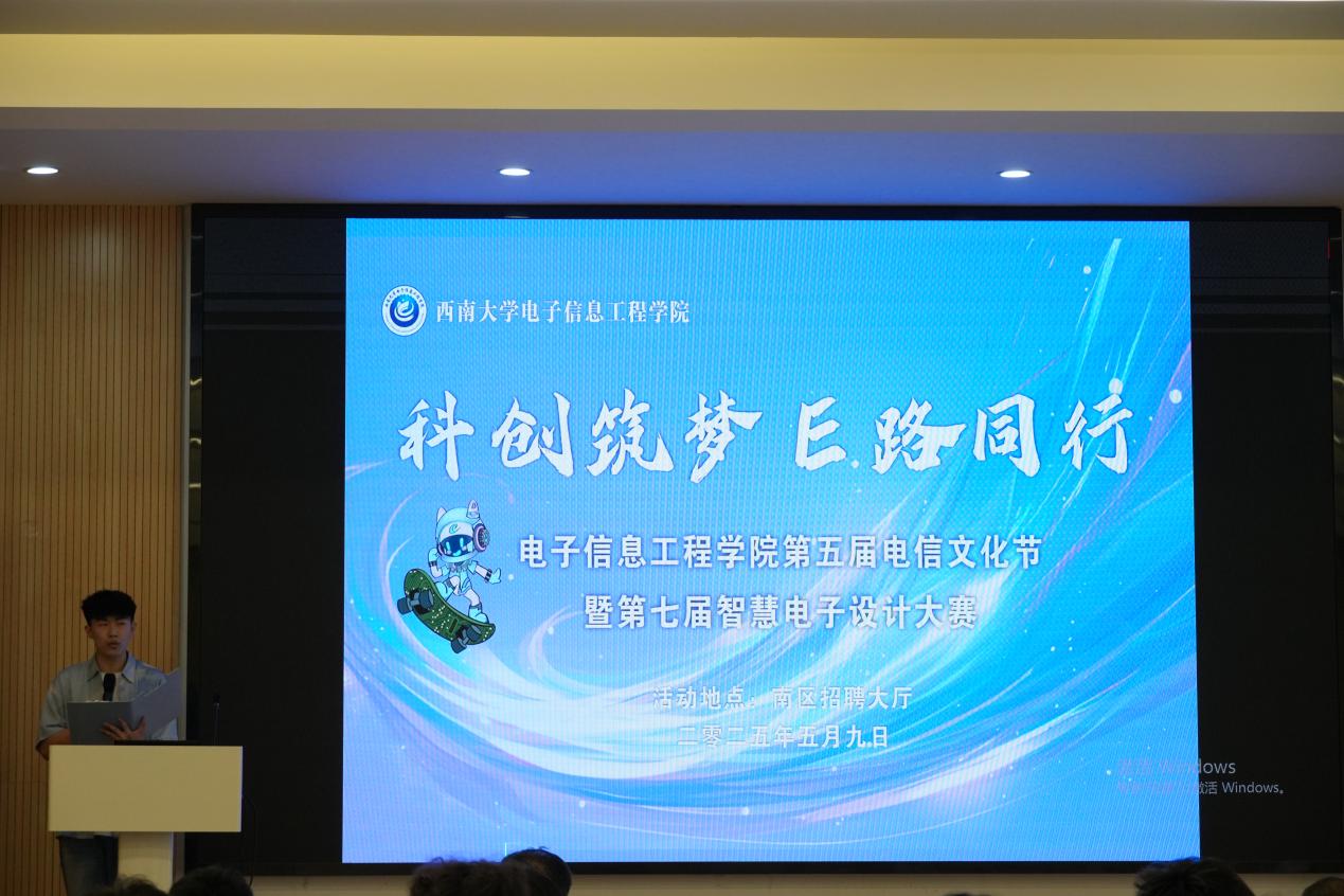 在2025年国际电信日即将到来之际,5月9日,学院第五届电信文化节暨第七届智慧电子设计大赛在南区招聘大厅如期举行。学院党委副书记 纪委书记谢俪、团委书记 学工办主任余琼、实验中心主任刘东卓、副主任周颖华、教师代表龙正吉、刘杨妮、闫宏政,以及12组参赛选手和学院百余名学生代表参加。
