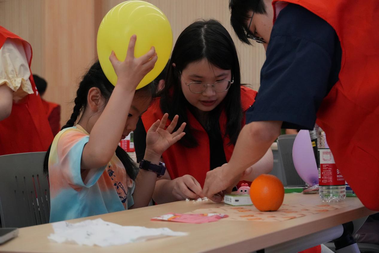 志愿者化身静电魔法师,将小纸块幻化成一个个小精灵,用气球在头发上摩擦后,小精灵成功被气球吸引起来。演示结束后,志愿者带领小朋友动手实践,亲身感受静电的神奇。静电魔法师再次登场,以跳跳糖为引,为小朋友带来了静电跳跳糖魔法,用毛皮摩擦后的橡胶棒靠近小精灵,小精灵在演示台上欢乐起舞。最后,志愿者通过有趣的讲解为小朋友解释了静电吸引的原理,揭示了静电的真面目。