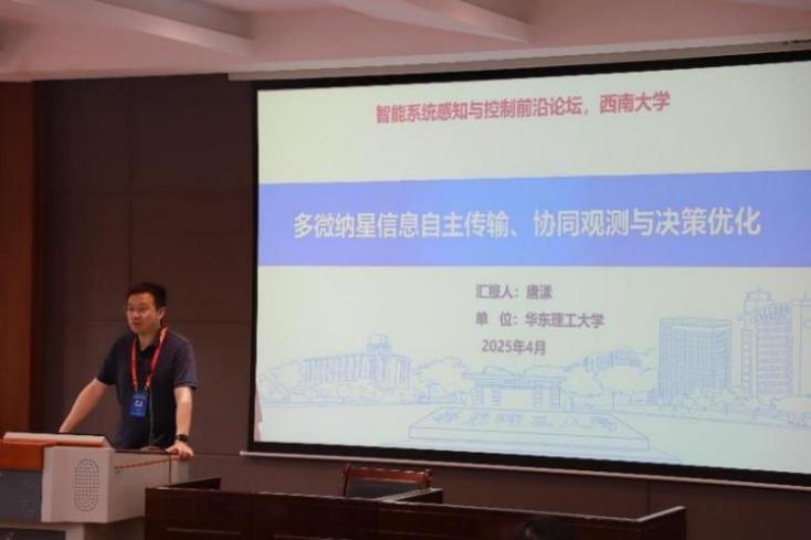 接着,论坛相继举办了7 场主旨报告,涵盖了智能系统感知与控制领域的多个前沿方向。上午,IEEE Fellow、国家级高层次人才、华东理工大学唐漾教授带来“多微纳星信息自主传输、协同观测与决策优化”的报告。唐漾教授针对微纳卫星资源受限的问题,基于智能无人系统等技术展开研究,为智能无人系统信息传输等理论与应用提供借鉴。