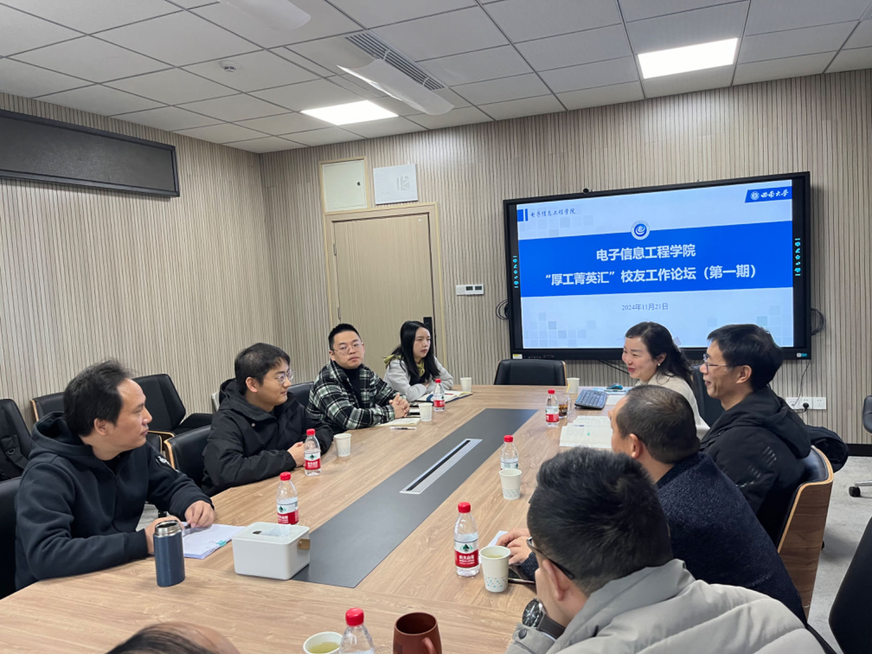在交流座谈环节,与会人员围绕大模型、大数据赋能、人工智能等课题展开了热烈的讨论。大家纷纷表示,要紧跟时代步伐,加强跨学科合作,不断提升学院的科研水平和创新能力。同时,还就校企项目合作、研究生联合培养、实习就业等话题进行了深入探讨,以期在更广泛的领域实现资源共享和优势互补。
